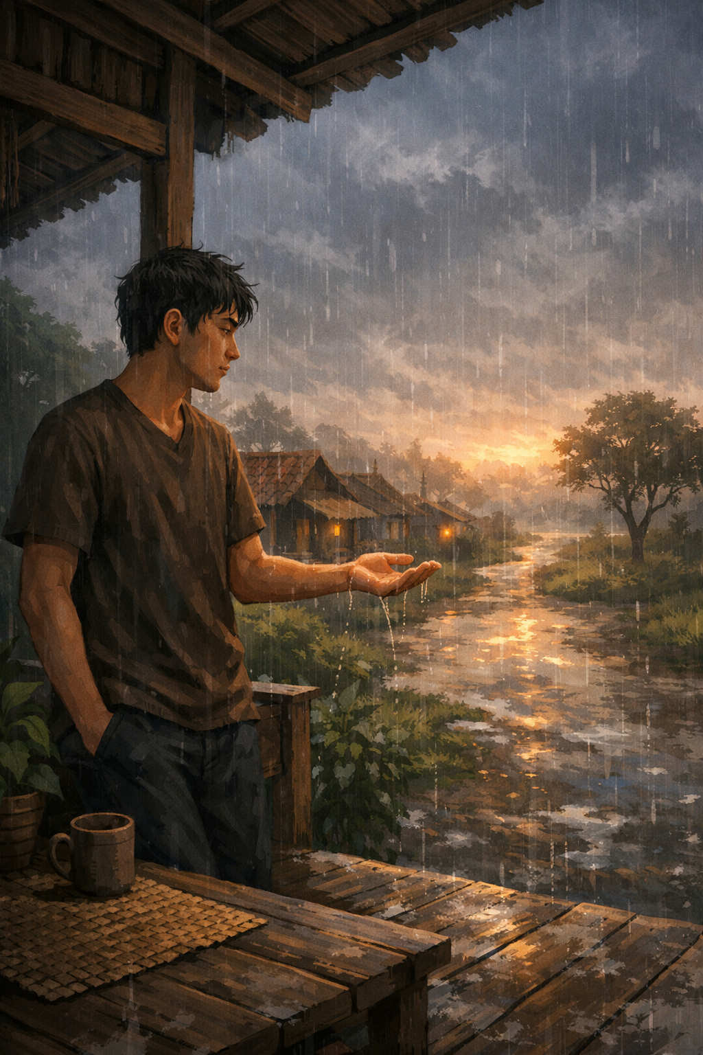Sore poé éta langit katémbong kulawu. Mega ngagantung handap, siga nahan carita anu can réngsé. Asep diuk nyorangan di tepas imah, nengetan jalan leutik di hareupeun imahna anu geus mimiti baseuh ku hujan. Angin ngahiap laun, mawa hawa tiis anu matak nambahan sepi.Ti baheula, Asep sok resep hujan. Ceuk anjeunna, hujan téh bisa ngumbah sagala kapeurih dina hate. Tapi sore éta béda. Unggal caina murag ka taneuh, haténa karasa beuki beurat. Émutanana balik deui ka mangsa harita, mangsa anjeunna jeung Euis sok silih antosan di waktu hujan.“Lamun hujan turun, urang moal pisah,” ceuk Euis baheula bari seuri.Tapi janji ngan kari janji. Euis ayeuna geus teu aya. Anjeunna pindah ka kota, ngudag kahirupan anyar, ninggalkeun lembur jeung carita-carita baheula. Ti harita, Asep teu kungsi nampa béja deui. Ngan hujan anu tetep satia datang, siga nu ngingetan kana sagala nu kungsi aya.Hujan beuki tarik. Asep nangtung, ngantepkeun caina ngabasahan dampal leungeun. Anjeunna narik napas jero-jero. Dina hate leutikna, anjeunna sadar yén henteu sakabéh anu dipikanyaah bisa tetep dipiboga. Aya waktuna kudu ngaleupaskeun.Sore poé éta, babarengan jeung hujan, Asep diajar ikhlas. Sanaos kenangan moal sirna, hirup kudu terus ngaléngkah. Hujan laun-laun eureun, langit mimiti caang. Dina sepi éta, Asep seuri leutik—anjeunna siap ngamimitian carita anyar.Piwurukna: hirup téh ngeunaan narima jeung ngantepkeun, sabab sagalana boga waktuna sorangan.