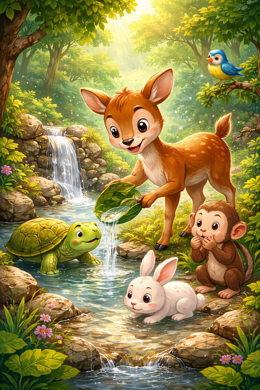 Di hiji leuweung anu héjo royo-royo, hiruplah hiji sato leutik ngaranna Si Kancil. Anjeunna kasohor pinter jeung gancang mikir. Sanajan kitu, Si Kancil henteu kungsi sombong. Anjeunna sok nulungan sasatoan séjén anu keur kasusah.Dina hiji mangsa, leuweung kakeunaan halodo panjang. Cai di walungan mimiti susut, jeung loba sasatoan ngarasa kasusah néangan inuman. Kancil ningali Si Kura-kura keur bingung di sisi walungan anu geus garing.“Ku naon, Kura-kura?” tanya Kancil kalem.“Abdi teu tiasa neangan cai, suku abdi laun,” walon Kura-kura sedih.Si Kancil tuluy mikir. Anjeunna inget aya pancuran leutik di jero leuweung anu masih kénéh aya cai. Tanpa ragu, Si Kancil ngabantu Kura-kura nepi ka tempat éta. Teu lila, sasatoan séjén ogé nuturkeun: kelenci, manuk, jeung monyét.Sanajan Si Kancil anu manggihan jalan, anjeunna teu kungsi nyebutkeun yén dirina anu pangpinter. Anjeunna malah ngomong, “Urang bisa salamet babarengan lamun silih tulungan.”Sasatoan séjén ngarasa kagum. Ti harita, maranéhna leuwih hormat ka Si Kancil, lain sabab kapinteranana wungkul, tapi sabab haténa anu handap asor.Piwurukna: jalma anu pinter tapi teu sombong bakal leuwih dipikanyaah jeung dihormat ku batur.